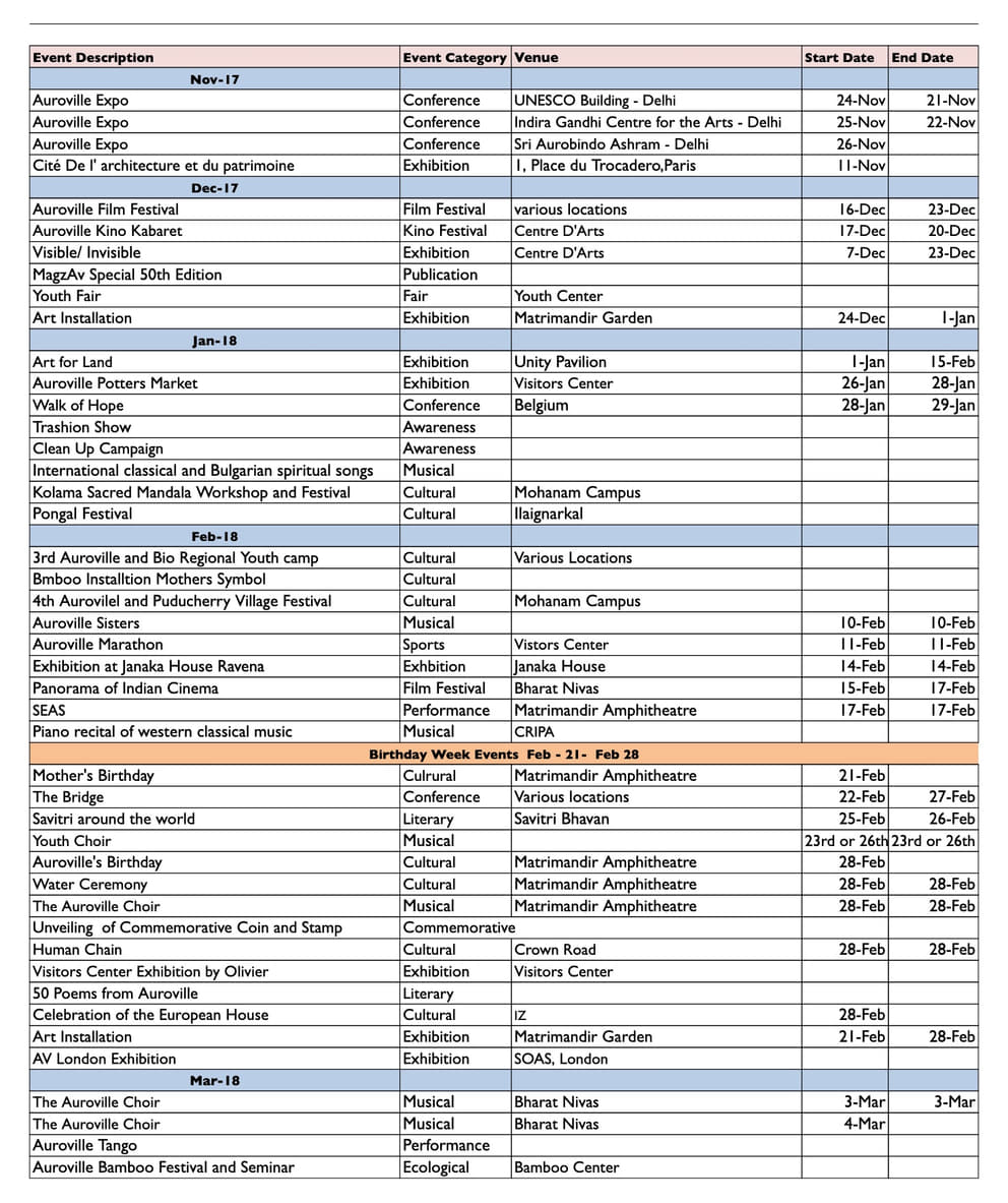 On February 28th 2018, Auroville will celebrate the anniversary of its 50th year. The occasion presents an unprecedented opportunity to honour the birth and vision of Auroville, to increase the recognition of its relevance for India and the world, to attract people of all ages from India and abroad to visit Auroville and participate in the events, and to document and share its journey of 50 years.